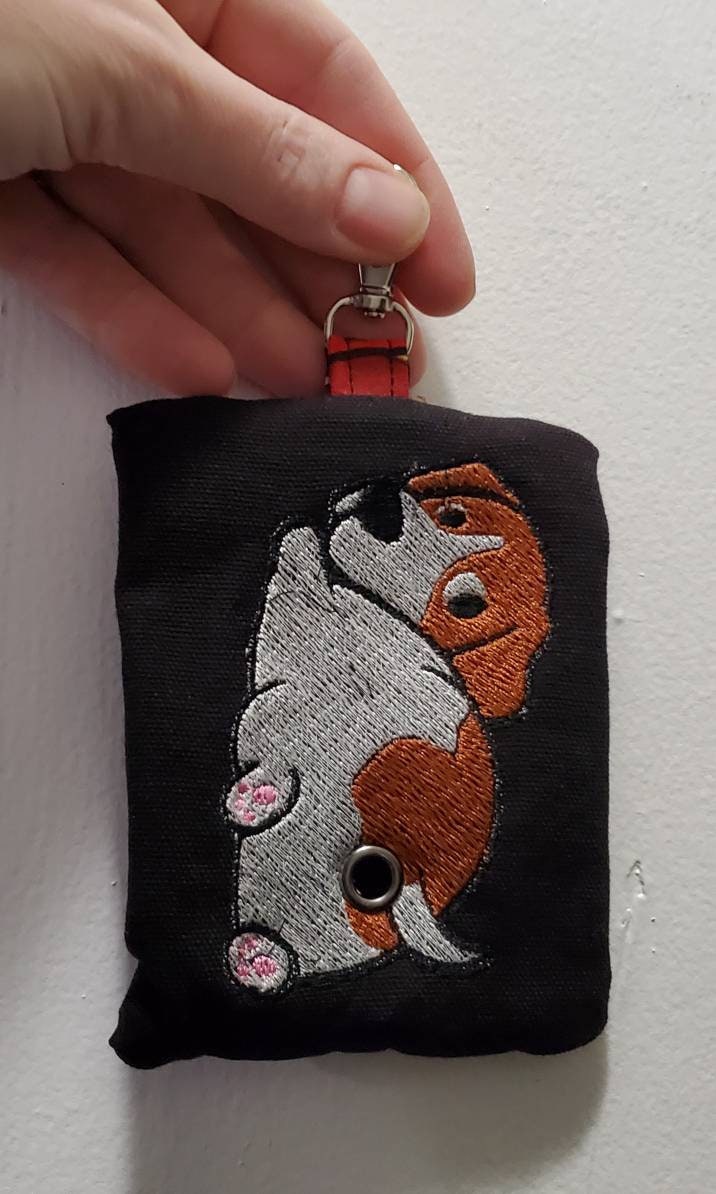 Please note fur color choice in customization box! Finished pouch measures approximately 4.5"x3.5" and will accommodate 2-3 rolls of plastic doggie bags. Outside fabric is your choice of black or white cotton canvas, lining fabric is woven cotton. Lining fabric is chosen at random, it my be a solid color or a print. Dispenser hole is reinforced with a metal grommet, and pouch includes a clasp to hook onto your leash or belt loop. (wrist strip available for additional charge).