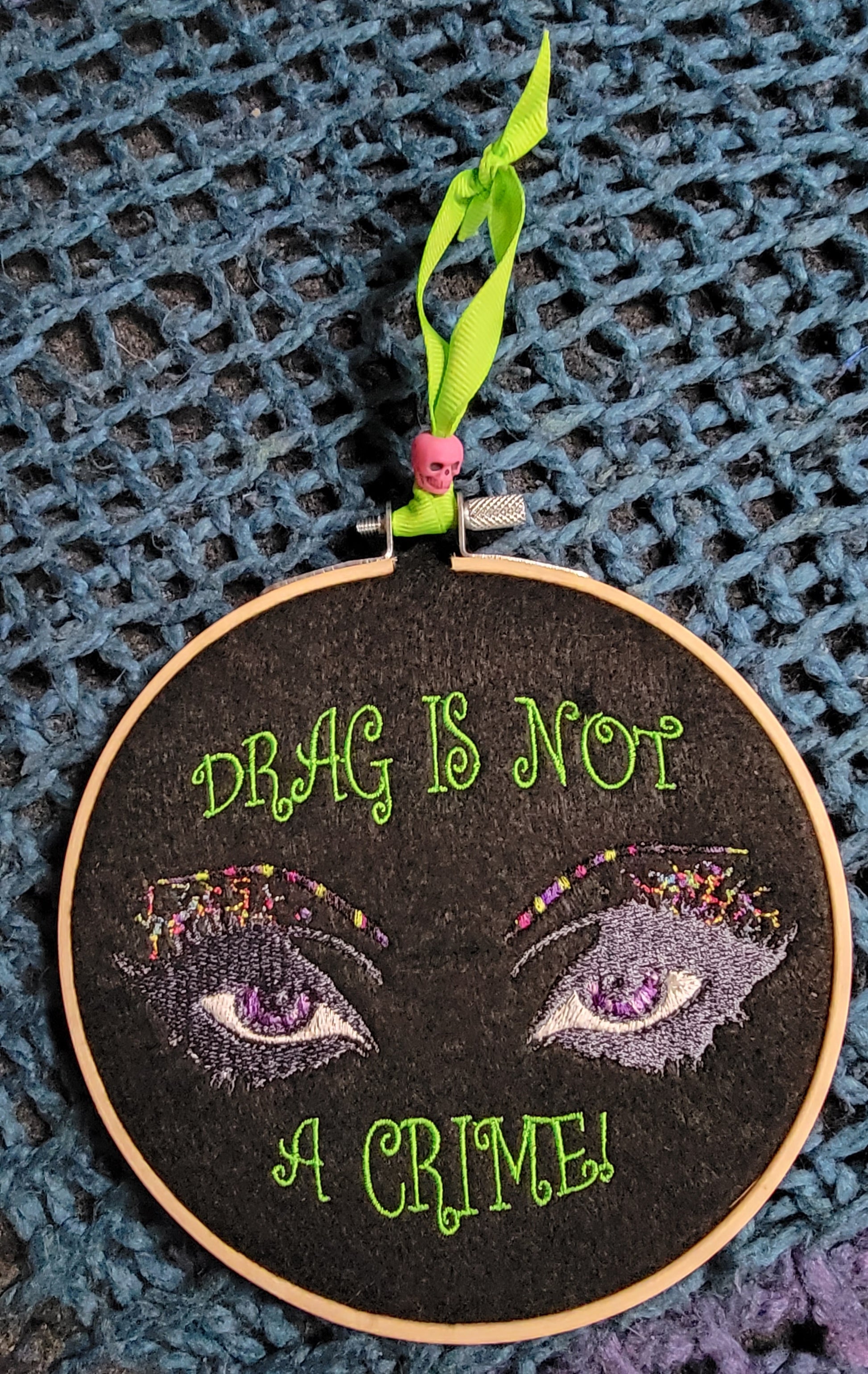5 inch round wood embroidery hoop with ribbon for hanging, machine embroidered design with Drag Queen Eyes and "Drag is Not a Crime!"