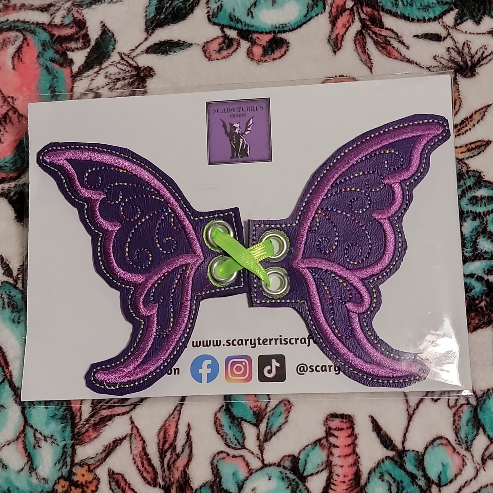 Embroidered Vinyl Fairy Wings to add to the laces of your shoes, boots, or skates! Each pair of Fairy wings measures approximately 4inx3in and has 2 holes reinforced with metal eyelets for your laces,