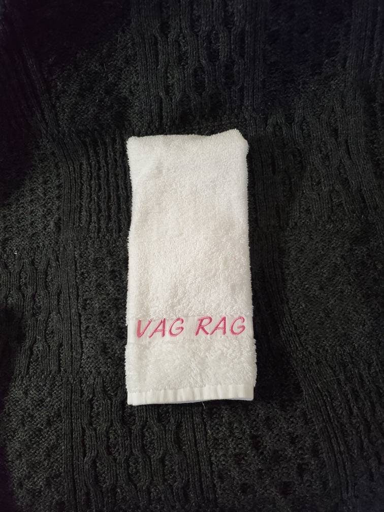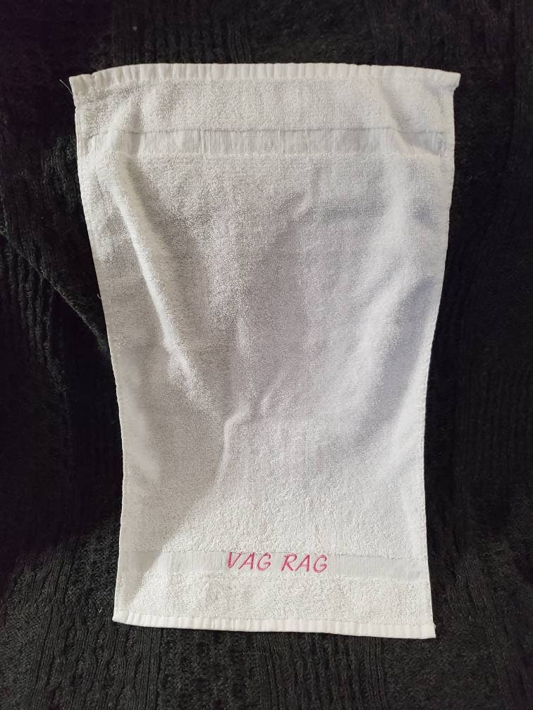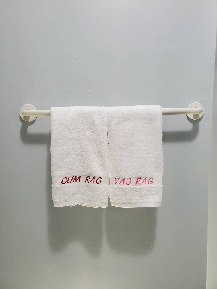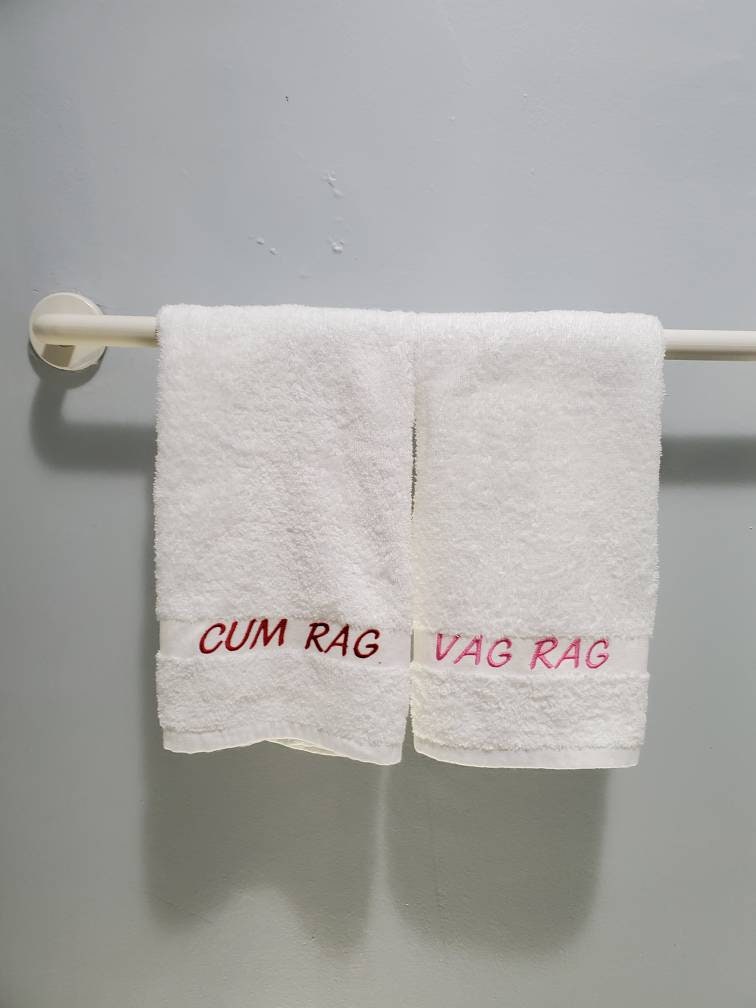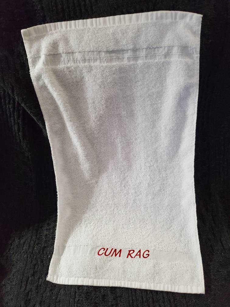 His or Her's after sex "CUM RAG" or "VAG RAG" novelty towel. Or your choice of custom text! White 100% Cotton Towels measure 16"x27" with the embroidery text along the 1" decorative band, text size is just under 1" tall. Your choice of text color