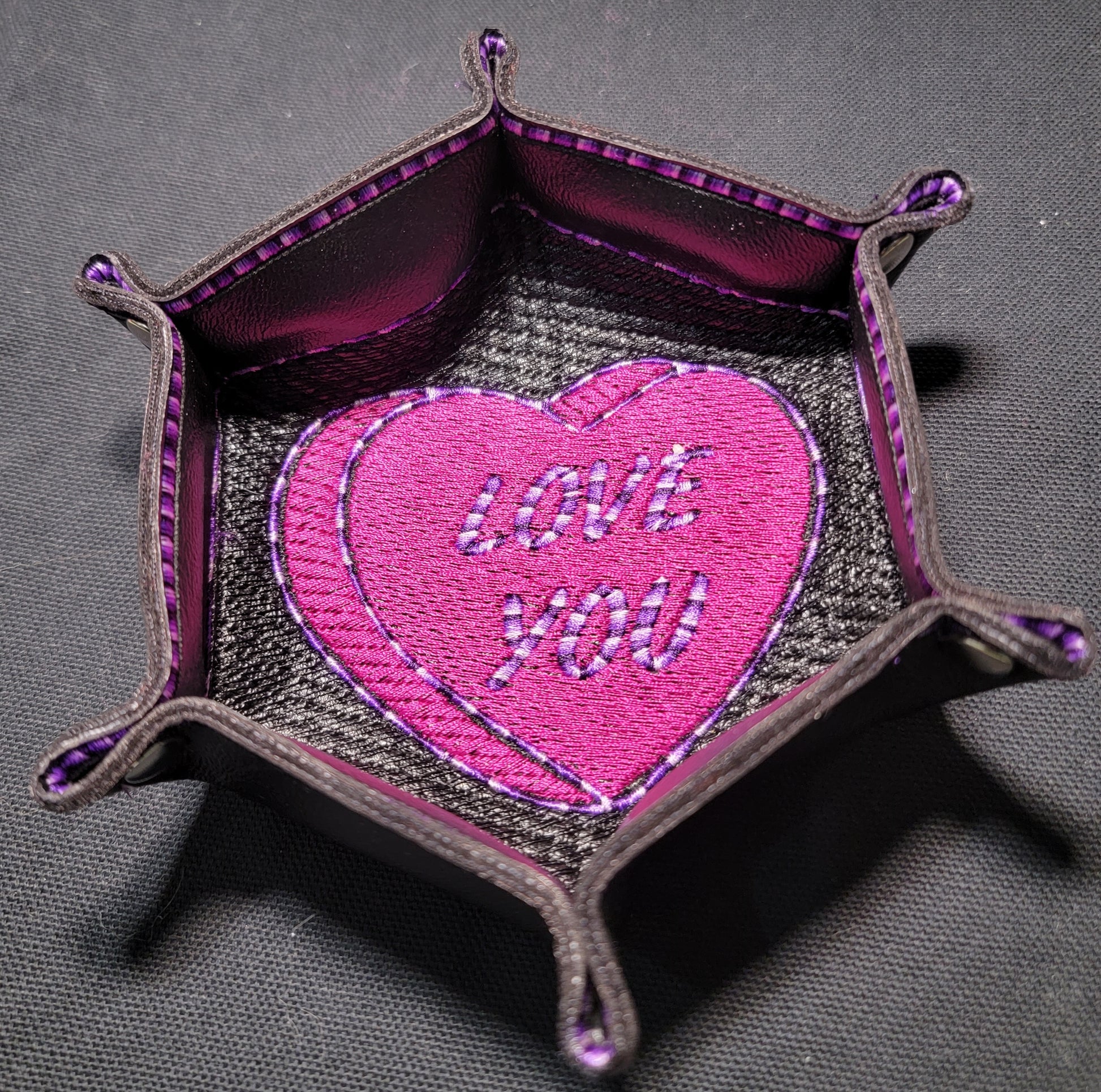 Candy heart Love You embroidery vinyl Trinket/Dice Dish. Dish Measures 6 inches across the widest points, the inside measure 4 inches across. 2 layers of sturdy vinyl secured around the edges with rivet