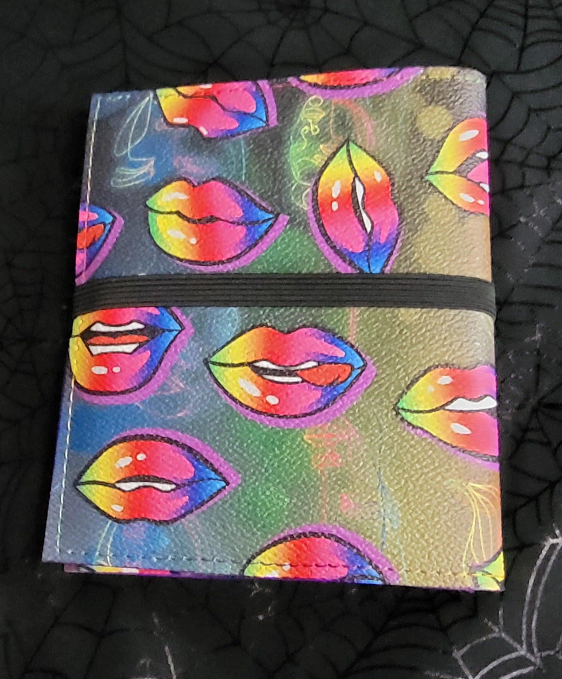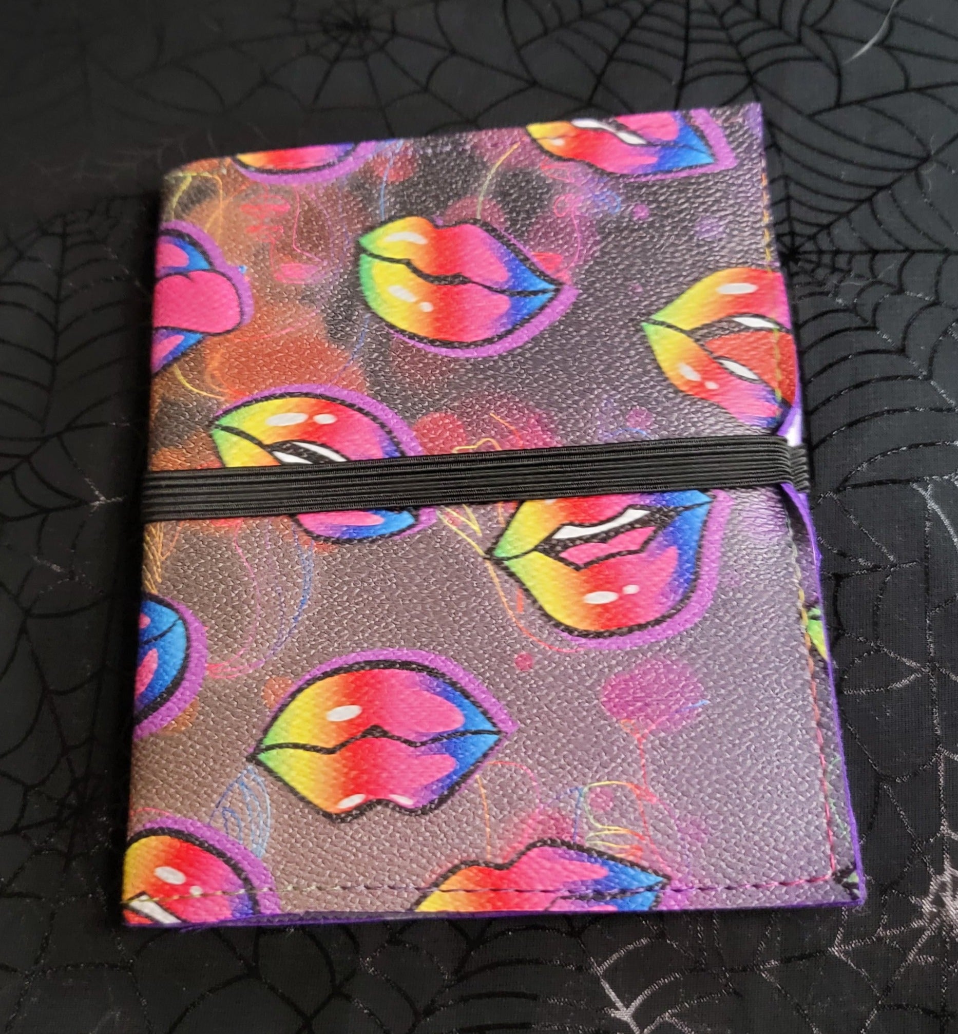This small reusable notebook cover measures about 6"x4.75" inches closed, 6"x9.5" open and has an elastic band to keep the book closed. You can put any small center fold notebook in this cover, a blank 50 page notebook is included.